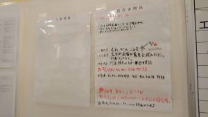 戸数が多いマンションでは複数の代理人で一緒に工事をすることもあるのですが、こういったアンケートもリスト化して事務所に掲示したり、お客様からお問い合わせいただいたことを書くための専用掲示板を設けたりしてうっかり忘れてしまうのを防ぐようにもしています。誰かがお客様から言われたことを一人で抱えてしまうと、お客様との約束を忘れてしまったり話が行違ってしまったりして、結果的にお客様にご迷惑をおかけしてしまうので。同じように、作業員と打合せしたことなども工事専用の掲示板に書いて共有するようにしています。現場代理人が複数いる時はとにかく共有できるようにするのが大切ですね。