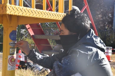 後日、当社作業員と外国人技能者にて中塗り・上塗りなど各遊具の仕様にあわせて仕上げ塗装をおこないました。子どもたちと一緒に楽しんだ体験日とは異なり、作業員はいつもの真剣な眼差しで仕上げに取り組んでいます。
